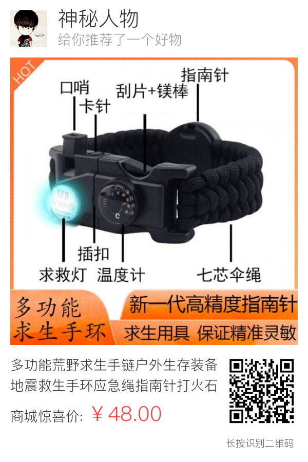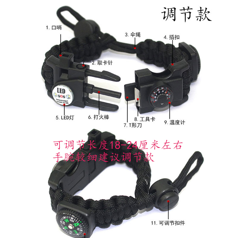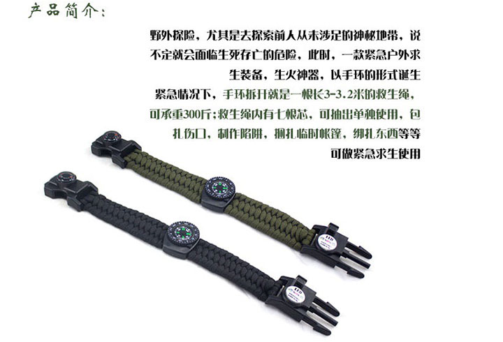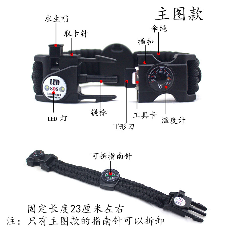 多功能荒野求生手链户外生存装备地震救生手环应急绳指南针打火石